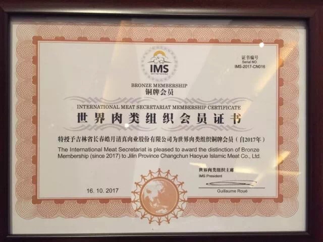 圖:世界肉類組織會員證書 近日,2017中國國際肉類產業(yè)周系列活動在青島隆重舉辦,在現(xiàn)場舉行的2017肉類產...